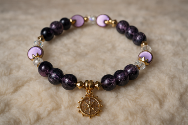Mit tiefvioletten Galaxie-Perlen, schimmernden Monden und einem goldenen Kompass-Anhänger – dein Wegweiser in dunklen Zeiten.